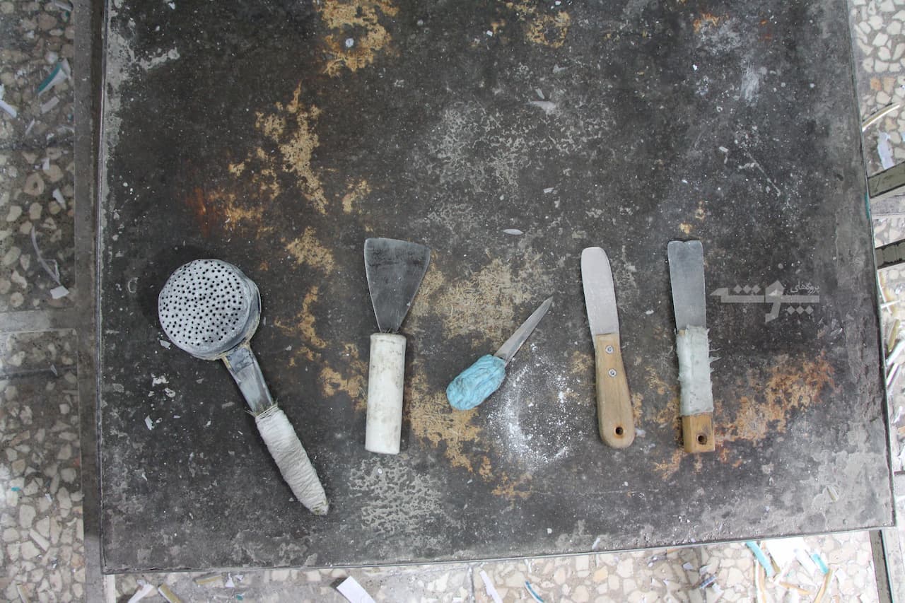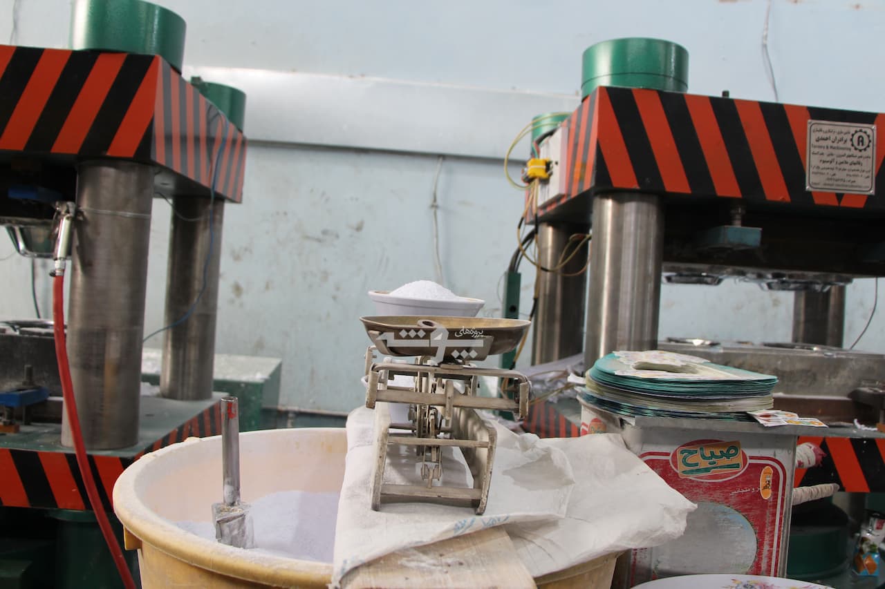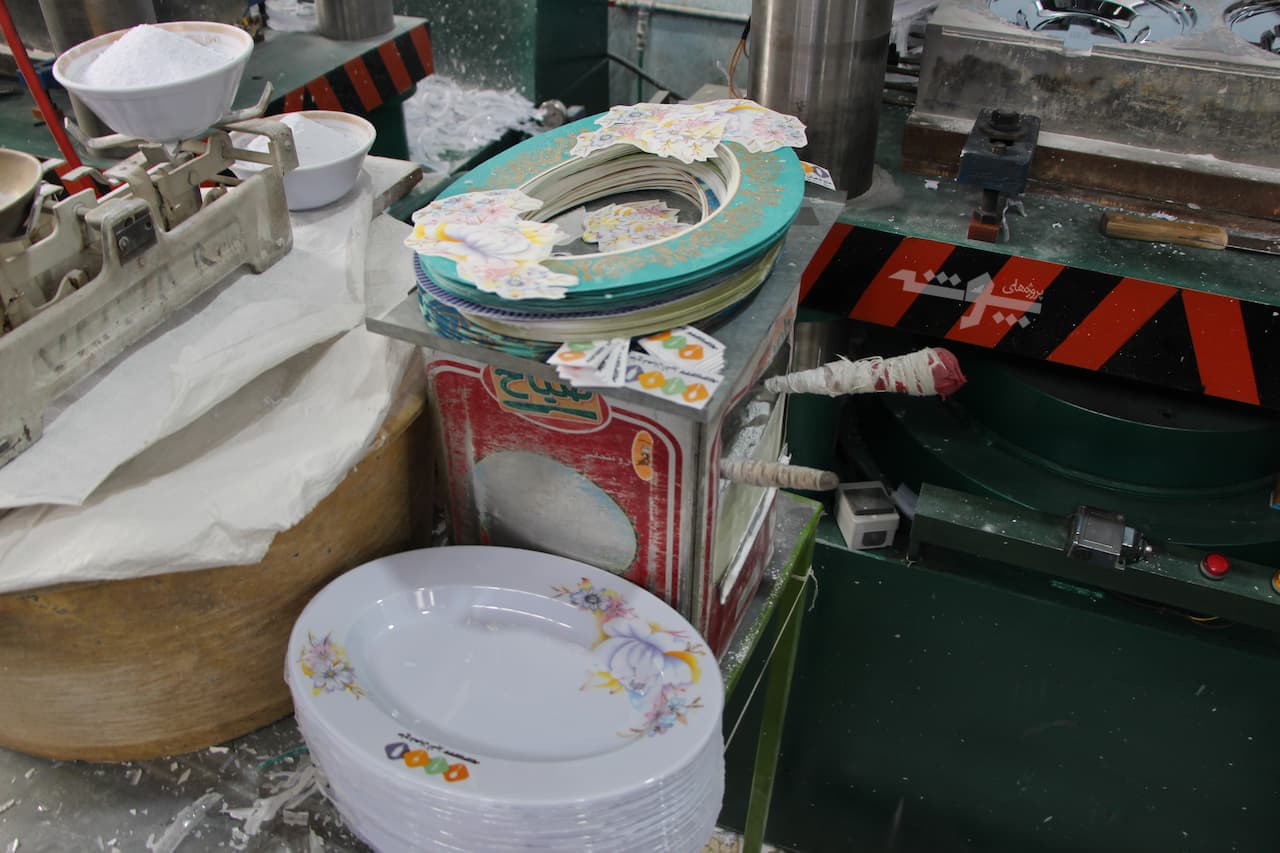 اولین دستگاههای پرس در خدمت «پلاسکوکار» قرار گرفت و اولین ملامینها تولید شرکت «پلاسکوکار» بود. پودر ملامین در ابتدابه شکل مواد آلی نبود، بلکه مواد سلولزی بود که ازدرخت کاج و گیاه پنبه که پس از فناوری توسط پتروشیمی تبدیل به پودر ملامین میشد. لایسنس پودر ملامین ابتدا ازکشور سوییس و سپس از آمریکا برای تولید در ایران گرفته شد. این پودر به کارخانههای بزرگ و سپس کارگاههای محلی ارسال میشد و در سه مرحله تبدیل به انواع ظروف و ابزار مورد نیاز در مخابرات میشد. امروزه پودر ملامین دارای ماده شیمیایی ازت است. اصول تولید ملامین آن است که پودر ملامین را داخل یک قالب در یک دستگاه پرس با تحت فشار حرارتی قرار دادن، تولید کرد؛ سپس موتیف را در بخشی از ظرف قرار میدهند و یک بار دیگر آن را پرسِ گرم میکنند. سپس روی آن پودر گلیز (شفاف کننده) میپاشند تا سطح آن یک دست شود. موتیفها بر کاغذ مخصوصی که نسوز است، امروزه توسط یک دستگاه دیجیتال طراحی چاپ و تولید میشود امروزه در بعضی از کارخانههای تولید ملامین به مِلاگلیز (Melamine Glazing Powder) نمک میپاشند.